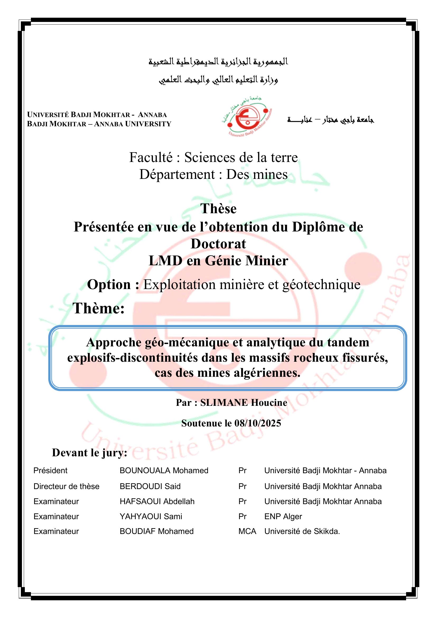 Approche géo-mécanique et analytique du tandem explosifs- discontinuités dans les massifs rocheux fissurés, cas des mines algériennes