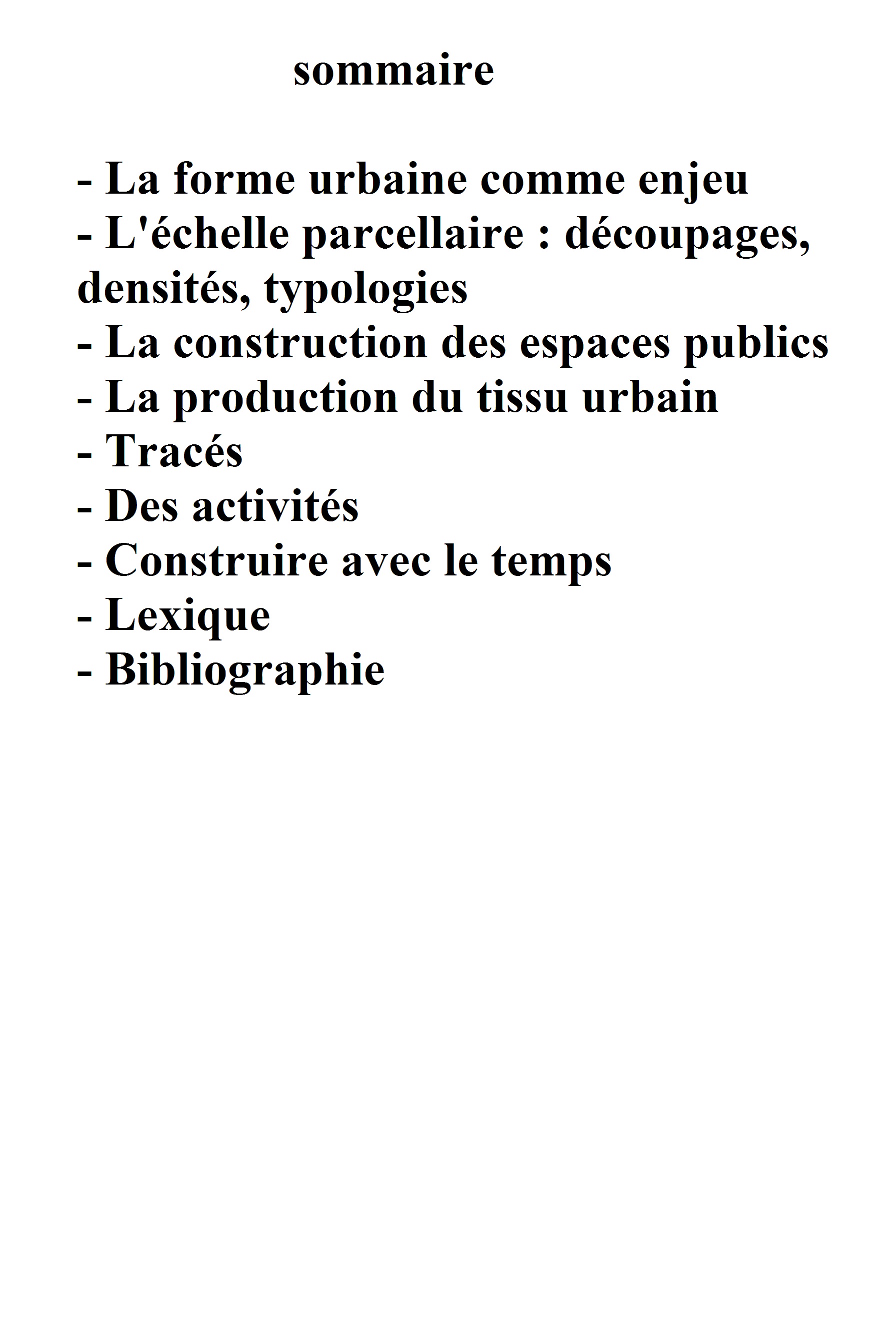 Le bâti ou plus largement les formes urbaines incluent des tracés, des découpages, des dispositions matérialisées, construites, inscrites sur le soi qui conditionnent les capacités de développement et de renouvellement des activités sur un territoire. Inscrites dans une longue durée, ces formes échappent rapidement aux conditions de leur création ; de produits elles deviennent contraintes voire causes. Si dans le passé il semble que l'élaboration de formes susceptibles d'accueillir, voire de favoriser le développement de la vie urbaine ait été de soi, tellement était partagée par les techniciens et les habitants une idée de la ville, la question aujourd'hui ne peut plus être résolue d'une manière quasi naturelle. Trop de ruptures sont intervenues dans les théories et les pratiques de l'urbanisme et la réflexion doit être reprise à la base. L'enjeu est clair : sommes-nous encore capables de contribuer modestement au développement des villes, c'est-à-dire non seulement d'étendre les territoires urbanisés et d'accroître le nombre de bâtiments mais de continuer à proposer aux habitants un cadre susceptible de s'adapter aux changements de modes de vie et aux modifications économiques ? Cet ouvrage qui s'apparente à un manuel où se mêlent constats et analyses de la réalité et propositions renoue consciemment avec les traités d'urbanisme du début du siècle. Il traite successivement des découpages, parcellaires et de leur ordonnancement en fonction des types bâtis, situe l'espace de la voie dans ses relations avec les terrains desservis et aborde à plus grande échelle la constitution du tissu et l'étude des grands tracés avant de mener une réflexion sur les activités et leur localisation.