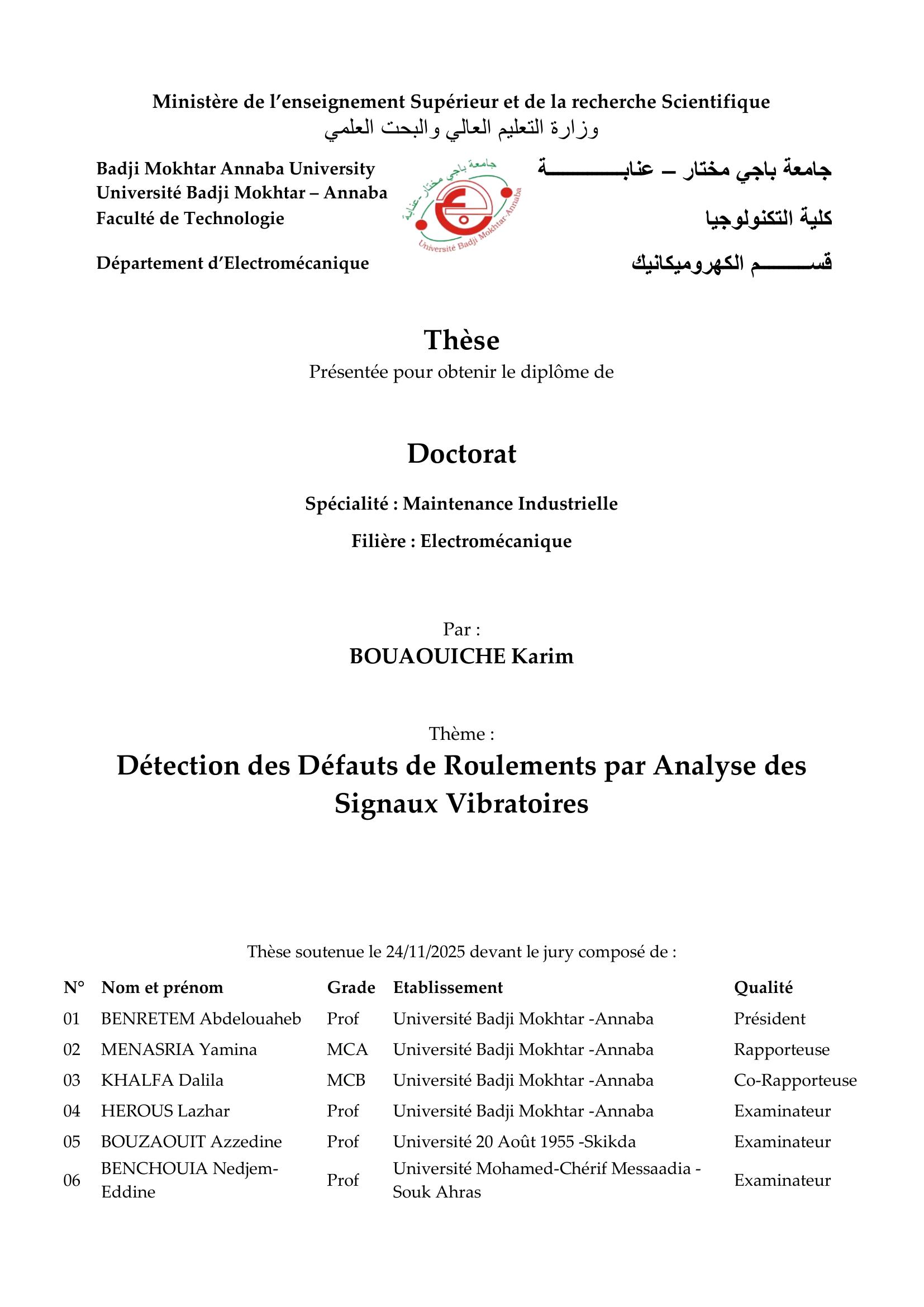 Plusieurs analyses de signaux de vibration du roulement sont effectuées afin de détecter les composants défaillants, à savoir la bague extérieure, la bague intérieure, la cage et la bille, à l’aide d’une méthode proposée basée sur le traitement des signaux de vibration. Cette méthode se compose d’étapes. La première consiste en la décomposition du signal en plusieurs composants à l’aide de l’algorithme EOE-LMD. Ensuite, une sélection des composants efficaces est réalisée à l’aide d’un indicateur proposé appelé symptôme de défaut. Cet indicateur est défini comme un produit entre l’énergie du signal et l’indice de Gini, permettant d’évaluer la présence de défauts. En effet, la présence d’un défaut se manifeste par une augmentation de l’énergie accompagnée d’un grand nombre d’impulsions dans le signal de vibration. Le seuil de l’indicateur permet- tant de déterminer l’état du roulement, qu’il soit défaillant ou sain, est fixé et défini par des essais réalisés sur des signaux de l’état sain ainsi que sur des signaux de défauts de la bague intérieure et de la bille du roulement 6205-SKF, disponibles dans la base de données de l’université de Case Western Reserve. Ensuite, en fonction des valeurs de l’indicateur symptôme de défaut, les composants obtenus après la décomposition sont sélectionnés comme utiles ou non. Les composants dont la valeur de l’indicateur dépasse le seuil (40,6) sont pris en considération pour reconstruire un nouveau signal, car ils contiennent des informations liées aux défauts. Ce signal correspond à la somme de tous les composants sélectionnés. Puis, la fonction d’autocorrélation est appliquée au signal afin de renforcer la composante impulsionnelle liée aux défauts. Ensuite, le spectre du logarithme de l’enveloppe du signal reconstruit met en évidence des pics importants aux fréquences des défauts du roulement. Lorsque la méthode proposée est appliquée sur les signaux disponibles dans les bases de données des universités Case Western Reserve, Paderborn, XJTU-SY et Ottawa, des pics d’amplitudes importantes sont observés aux fréquences des défauts. La méthode de détection de défaut proposée est efficace, car elle présente un spectre d’enveloppe plus simple que les autres formes de spectres, avec une réduction du bruit et de la plage dynamique de variation de l’amplitude du signal. Cela permet de détecter des défauts qui étaient masqués par une amplitude élevée. De plus, une comparaison entre la méthode de détection basée sur la démodulation, la méthode de déconvolution et la méthode proposée montre des résultats très proches, mais avec une différence notable dans les amplitudes des pics situés aux fréquences caractéristiques des défauts.