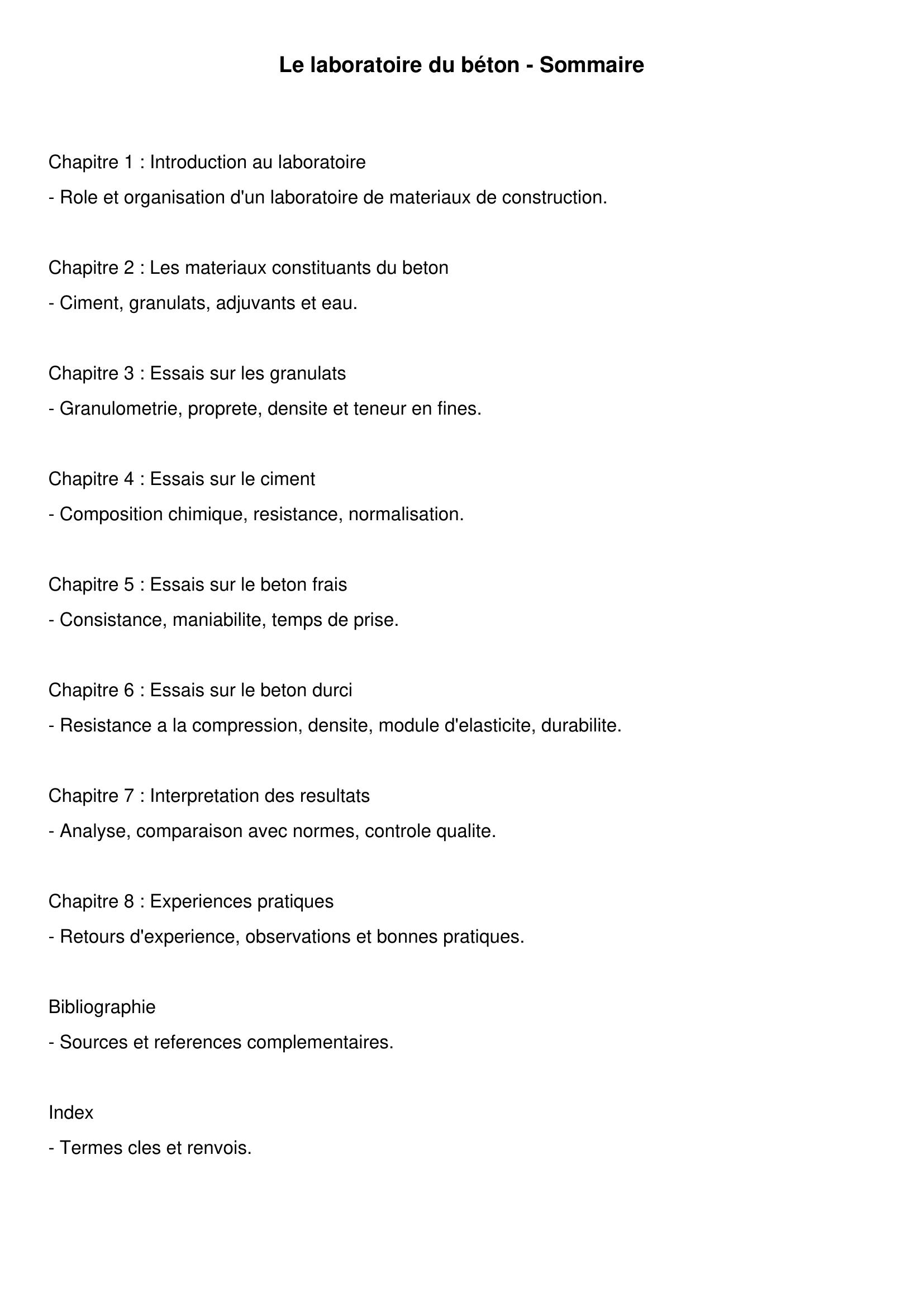 L’ouvrage Le laboratoire du béton est un manuel pratique et technique destiné aux étudiants en génie civil, aux techniciens de laboratoire et aux professionnels du bâtiment. Il traite essentiellement des essais de laboratoire relatifs aux matériaux utilisés dans la construction, avec un accent particulier sur le béton et ses composants.