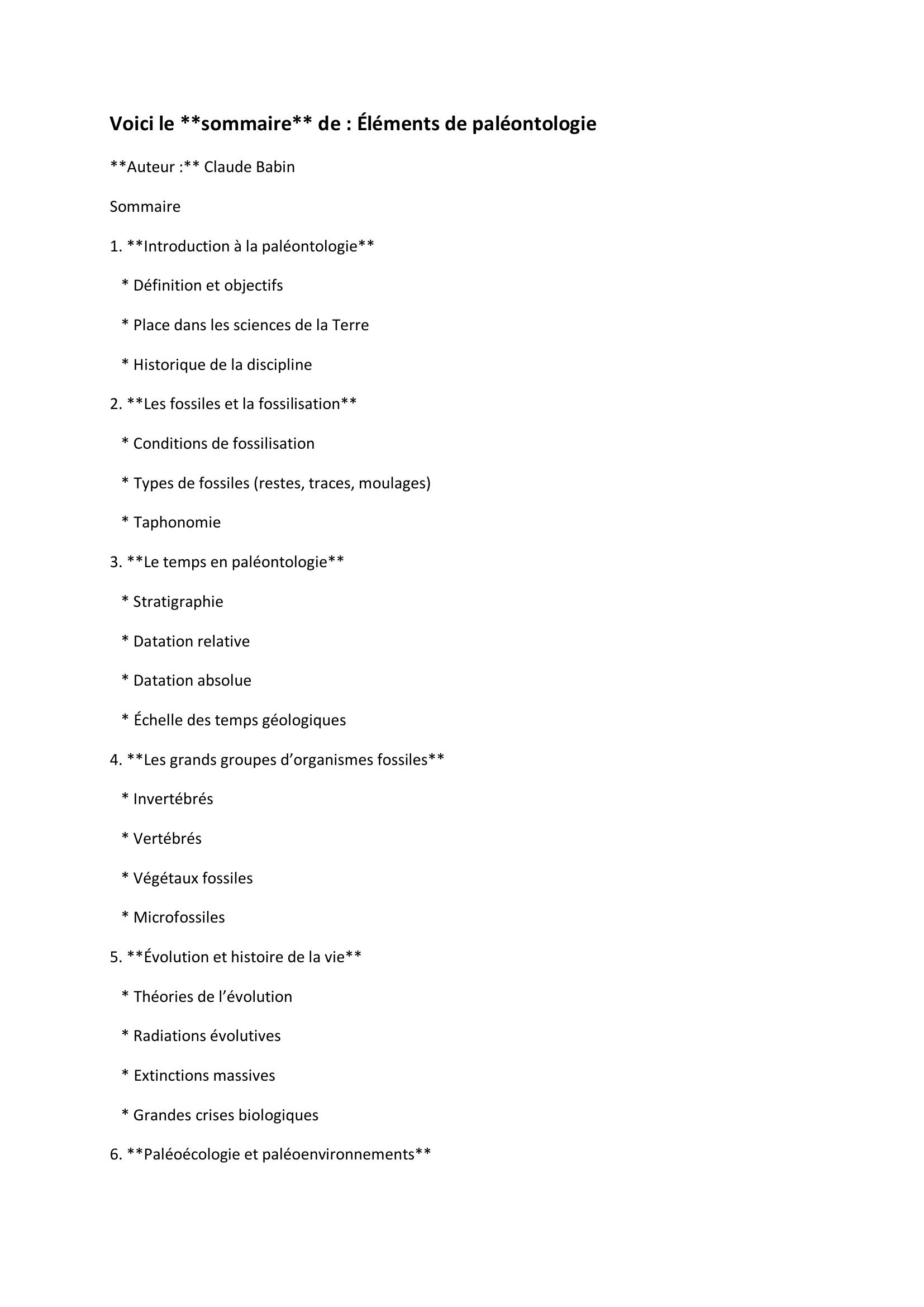 Cet ouvrage propose une introduction complète à la paléontologie, science qui étudie les êtres vivants du passé à partir des fossiles. Claude Babin y présente les bases théoriques et méthodologiques nécessaires pour comprendre l’histoire de la vie sur Terre, depuis les premières formes de vie jusqu’aux organismes plus complexes.