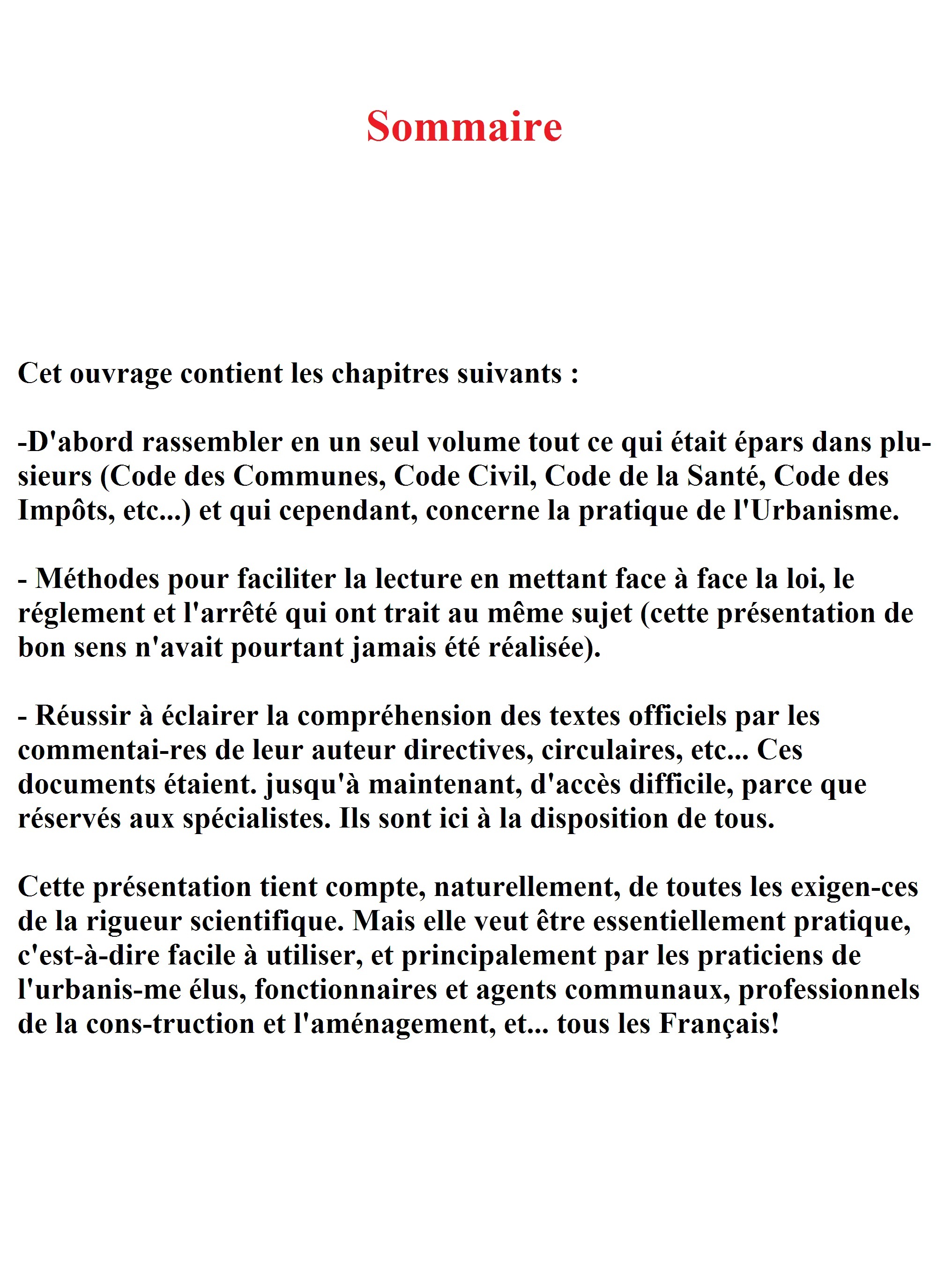 L'Urbanisme concerne tous les Français. Qu'il habite à la ville ou à la campagne, chaque citoyen, est affecté, dans son existence quotidienne, dans son cadre de vie, dans ses choix d'avenir, par les décisions d'urbanisme. Celles-ci sont prises conformément à un ensemble de règles complexes qui constituent le Droit de l'Urbanisme. Jusqu'ici ce droit était l'affaire de quelques fonctionnaires spécialisés, juristes compétents, mais souvent fort éloignés du lieu d'application de leurs décisions et, en tout cas, sans responsabilité à l'égard de ceux qui devaient être régis par leur choix. Désormais, l'urbanisme est l'affaire de tous. C'est une sorte de révolu-tion juridique la compétence pour les principales décisions (celles qui vont définir la structure de la ville et les modalités d'utilisation du sol) a été transférée aux collectivités locales, et notamment aux communes. A travers les élus, chaque citoyen se trouve concerné, et en quelque sorte compétent. Il faut donc que le droit de l'Urbanisme sorte de l'ésotérisme et de l'opacité dans lesquels il était enfermé. Il faut que tous les citoyens, d'abord les élus mais aussi les autres, puissent en connaître et en comprendre les rè-gles.