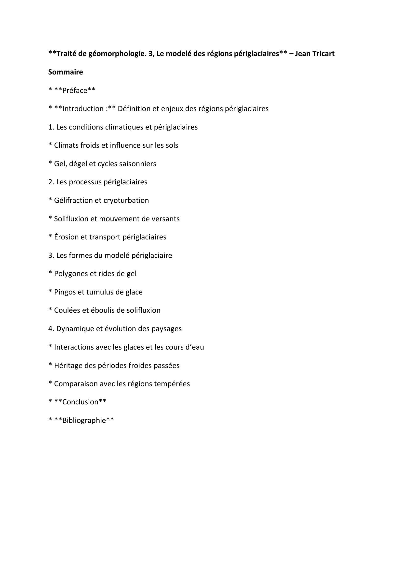 L’ouvrage analyse les processus périglaciaires tels que la gélifraction, la solifluxion et la cryoturbation, qui modèlent les sols et les versants. Il décrit les formes caractéristiques (polygones de gel, pingos, coulées de solifluxion, éboulis) et explique leur dynamique en fonction des conditions climatiques.