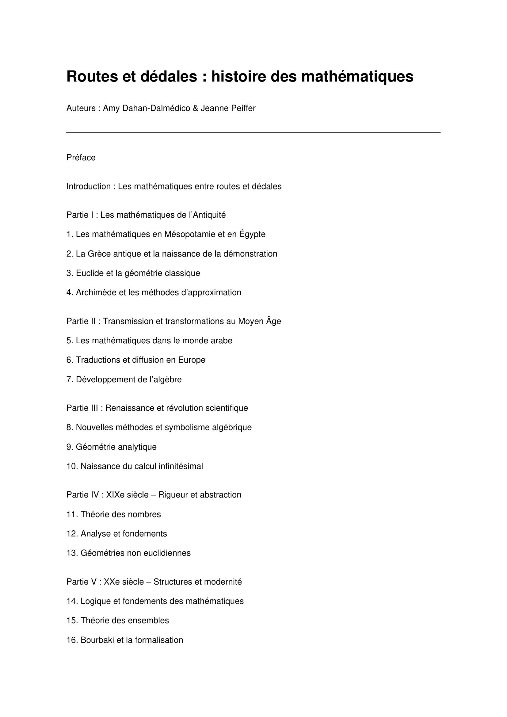 Cet ouvrage décrit dans une première partie les conditions générales de naissance et de développement de l'activité mathématique. Les auteurs s'intéressent, au travers du contexte historique, aux environnements culturels, économiques et institutionnels du déroulement de cette pratique scientifique. Le cadre est ainsi fixé pour l'étude précise de différents thèmes : équation, espace, limite, lois, opérations, notions fondamentales auxquelles tout élève, étudiant, enseignant et confronté. Routes et Dédales retracent leur évolution par l'histoire des conjectures, des hésitations, des impasses, des modèles concurrents, des intuitions fulgurantes, des synthèses théoriques... Aperçu de l'extraordinaire enchevêtrement des disciplines mathématiques. Les mathématiques ne se présentent donc pas, ici, comme un corps figé d'axiomes, théorèmes, lemmes et corollaires ; elles tissent une toile en devenir qui suscite bien des curiosités.