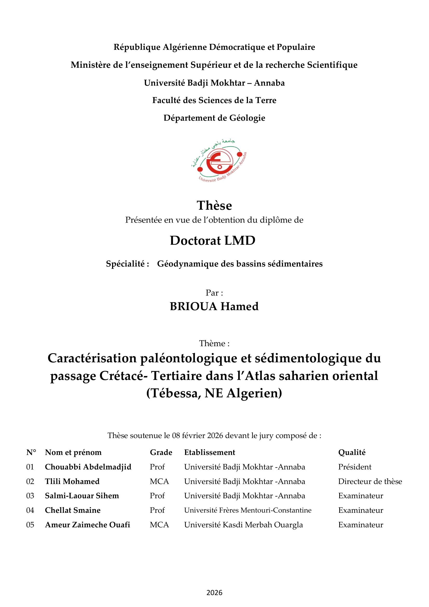 Caractérisation paléontologique et sédimentologique du passage crétacé - tertiaire dans l’atlas saharien oriental (Tébessa, NE algérien)