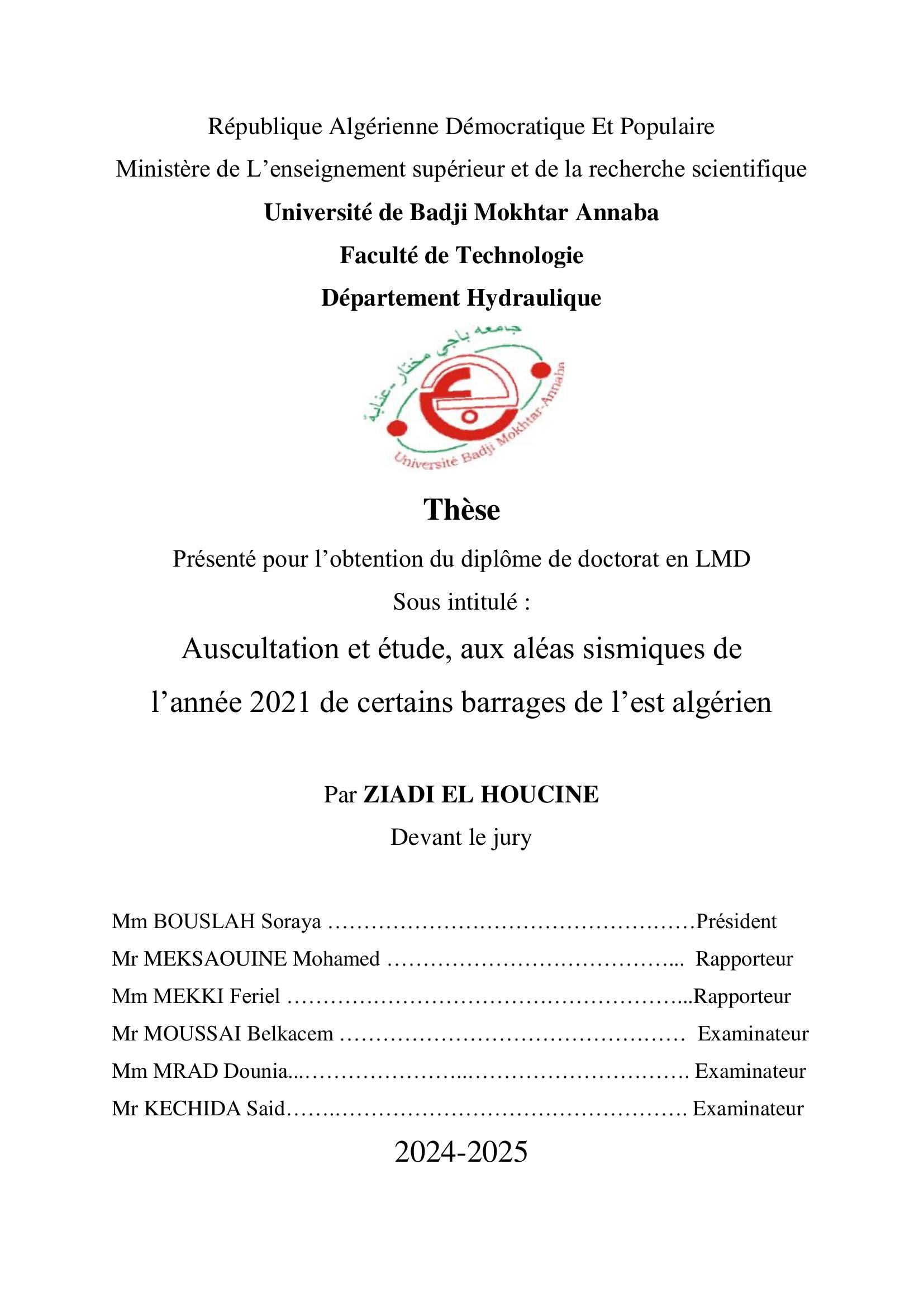 Auscultation et étude, aux aléas sismiques de l’année 2021 de certains barrages de l’est algérien