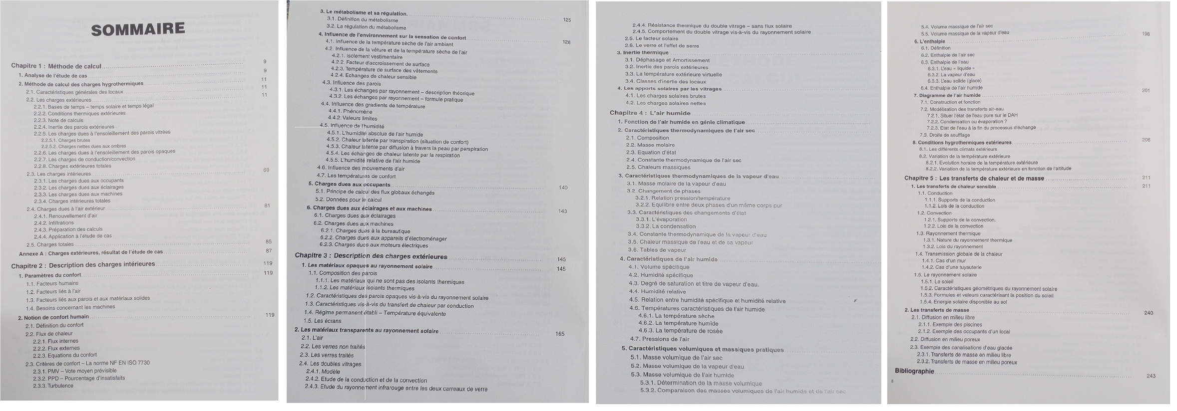 Le premier chapitre est consacré à la méthode elle-même et permet d'apprendre à l'utiliser sur la base d'une étude de cas. On y calcule les charges extérieures et les charges intérieures d'un bâtiment de bureaux en appliquant les données les plus récentes (normes, publications françaises et européennes...). Le chapitre deux est consacré à la description physiologique, physique et statistique du confort humain et à l'expression des charges dues aux occupants, aux machines et aux éclairages. La norme EN ISO 7730 est largement abordée, ainsi que son application dans la méthode que nous proposons. Enfin toutes les formules utiles à l'établissement des tables de calculs des charges internes sont données. Le lecteur qui souhaite développer des calculs concernant des configurations et des projets particuliers, non prévus par les tables du livre, en a donc la possibilité. Le troisième chapitre s'intéresse aux comportements des matériaux soumis aux rayonnements solaires et infrarouges. On y trouvera en particulier toutes les formules et les concepts concernant les températures équivalentes, les températures virtuelles, les inerties et les charges extérieures. Dans le chapitre quatre sont traités les éléments qui décrivent les caractéristiques et les comportements de l'air humide et de ses composants. On y trouve aussi la définition de la droite de soufflage caractérisant, dans le diagramme de l'air humide, l'action thermodynamique des charges d'un local sur l'air. Le chapitre cinq rappelle, quant à lui, les lois des transferts de chaleur et de masse, les formules qui régissent les mouvements solaires et précise les caractéristiques des flux de chaleur engendrés par le soleil. D'une manière générale, toutes les formules de calcul des valeurs données dans les ables sont fournies dans l'ouvrage. Cela permettra à chacun d'élargir le champ d'étude Volontairement restreint, offert par les tables.