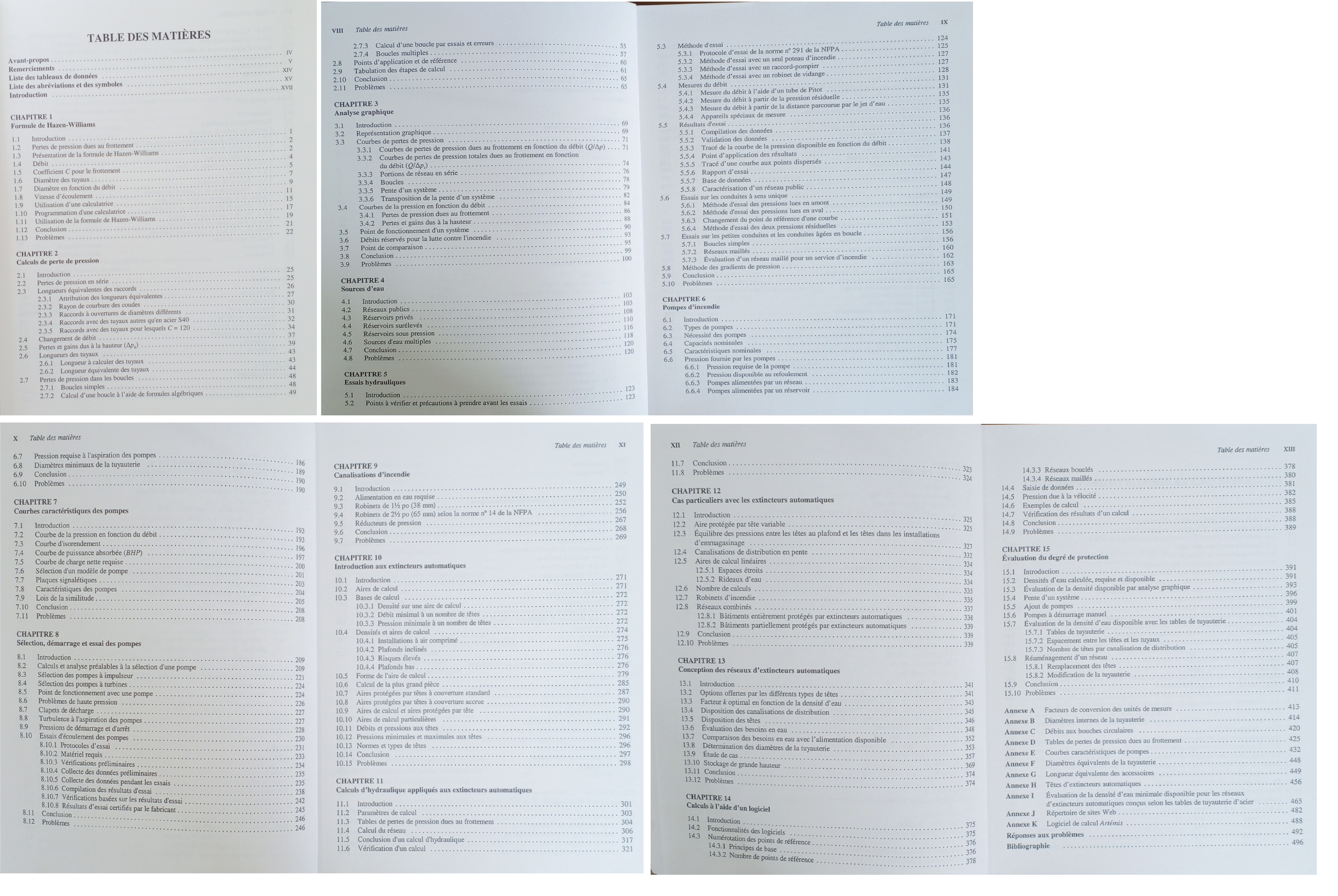 Ce texte présente la deuxième édition d'un ouvrage technique spécialisé dans la protection contre l'incendie. Il inclut de nouveaux problèmes, exemples, et chapitres sur la conception de réseaux d'extincteurs automatiques. Le contenu couvre la longueur équivalente des accessoires et les essais hydrauliques. C'est une ressource destinée aux ingénieurs, technologues, entrepreneurs et techniciens en prévention.