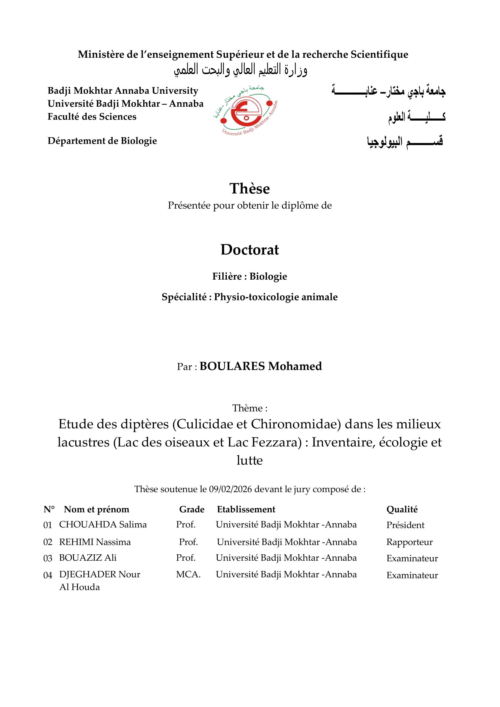Etude des diptères (Culicidae et Chironomidae) dans les milieux lacustres (Lac des oiseaux et Lac Fezzara)
