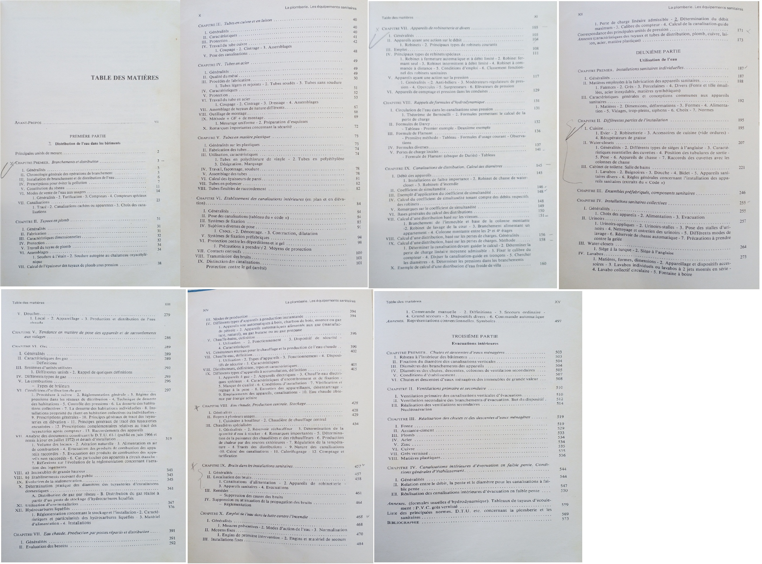 Nous pensons que le présent ouvrage sera consulté avec profit par les élèves voulant apprendre la technique du bâtiment, par les architectes, par les entre-preneurs, par les professionnels des diverses spécialités du bâtiment recherchant un renseignement précis d'ordre pratique, soit au cours de l'élaboration d'un projet de bâtiment neuf ou de transformation, soit pendant l'exécution.>>>> Ce livre est divisé en trois parties principales intitulées : 1re Partie: Distribution de l'eau. 2º Partie: Utilisation de l'eau. 3e Partie: Evacuations intérieures.