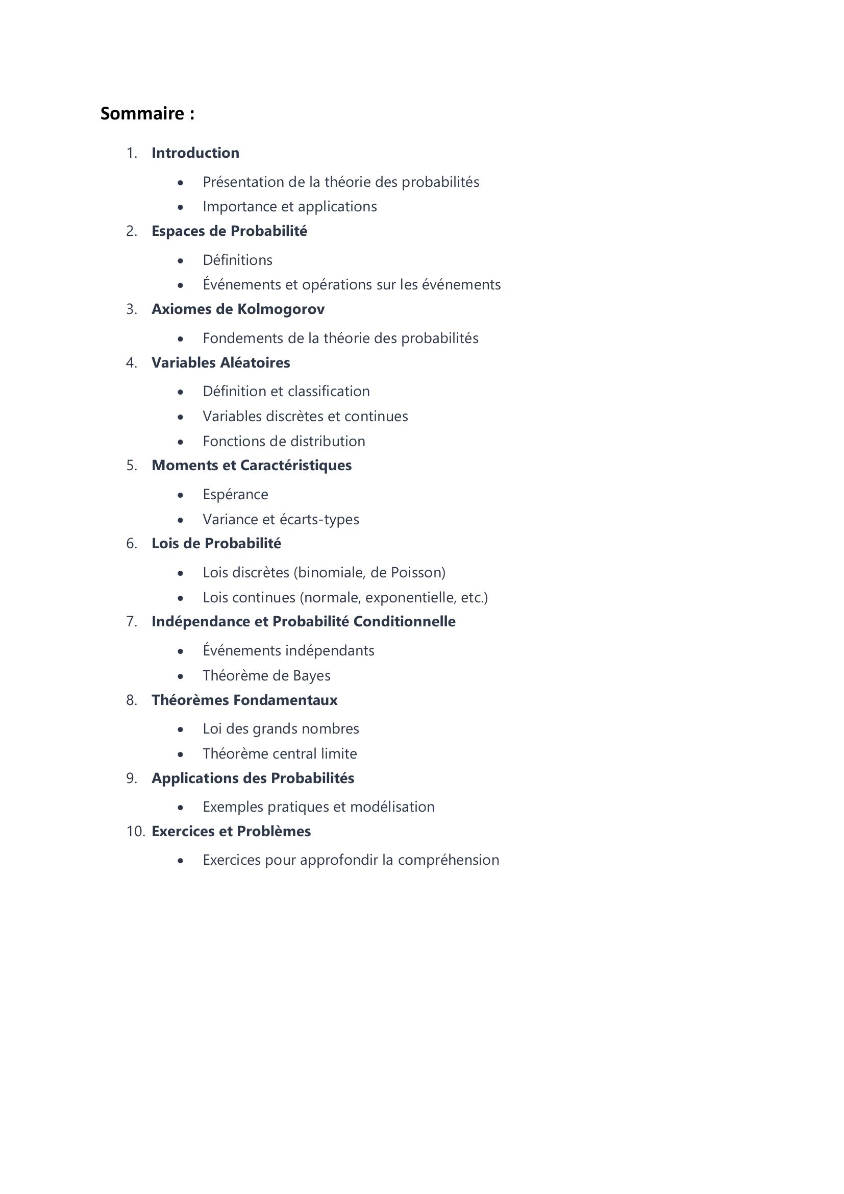 Cet ouvrage est conçu pour être une ressource pédagogique, visant à rendre la théorie des probabilités accessible aux étudiants et aux praticiens, tout en fournissant une base solide pour des études plus avancées dans le domaine.