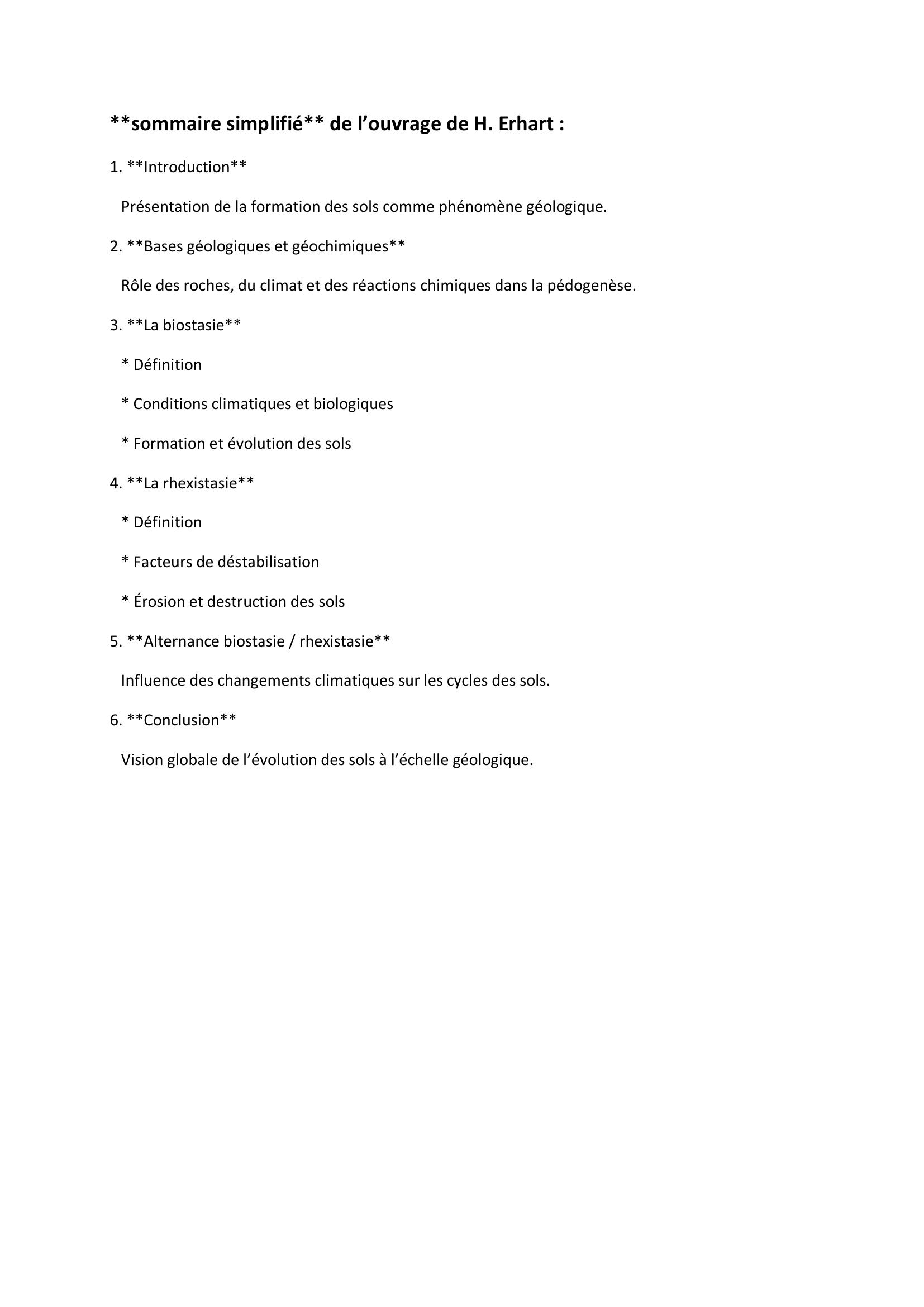 Dans La genèse des sols en tant que phénomène géologique, H. Erhart propose une théorie expliquant la formation des sols à travers une approche géologique et géochimique. Il montre que les sols ne sont pas seulement des couches superficielles, mais le résultat de processus dynamiques liés au climat, à l’érosion et à l’activité biologique.